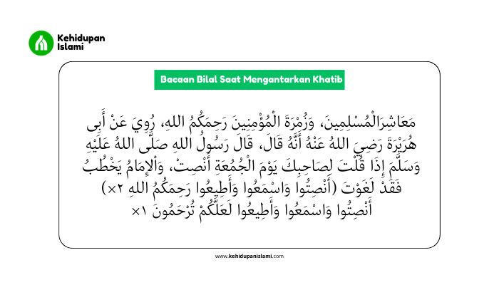 “Ma’a syirol muslimin, wa zumrotal mu’minina rohimakumulloh, ruwiya ‘an abi hurairota rodliyallohu’anhu annahu qoola, qoola rosulullohi shollallohu ‘alaihi wa sallam idza qulta lishohibika yaumal jum’ati anshit, wal imaamu yakhtubu faqod laghout -Anshitu wasma’u wa athi’u rohimakumulloh 2x- Anshitu wasma’u wa athi’u la’alakum turhamun”