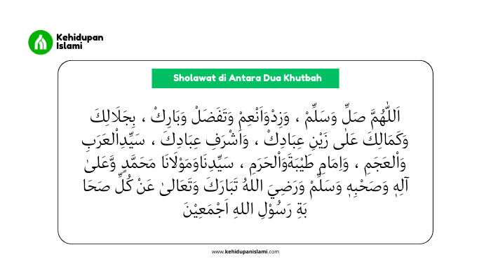 Saat khatib duduk di antara dua khutbah, bilal membacakan sholawat. Salah satu bacaan yang populer adalah: